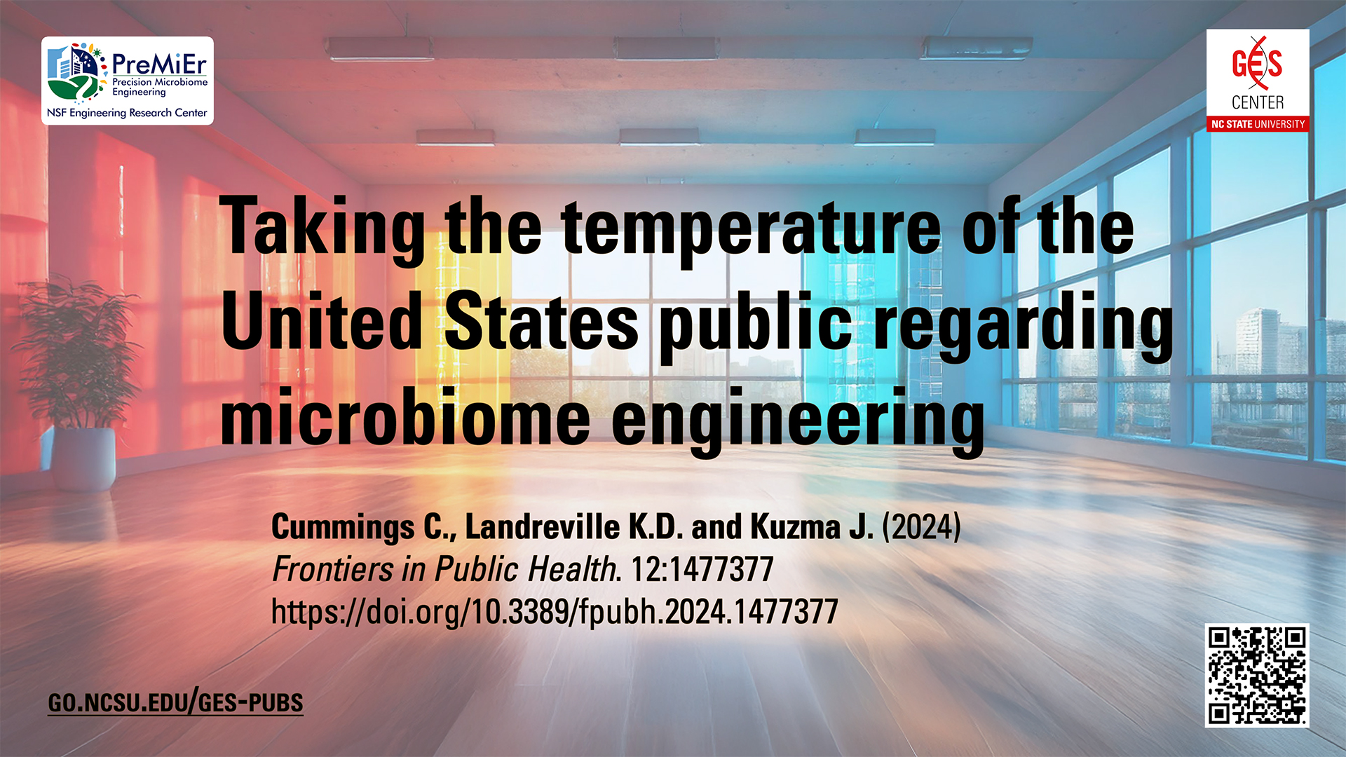 CONGRATULATIONS to PreMiEr researchers Christopher Cummings, Kristen Landreville, and Jennifer Kuzma for their paper just published in Frontiers in Public Health.   The team surveyed 1000 U.S. adults for their opinions on microbiome engineering of the built environment and hope that this information will aide researchers and policymakers going forward as the technology emerges.