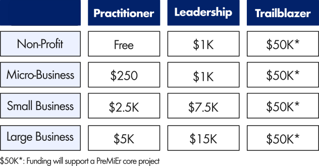 Companies may join the PreMiEr Industry Member Program at the PractitionerLeadership, or Trailblazer level. Member fees, benefits, and obligations are outlined below, and described in more detail in the PreMiEr Membership Agreement.
